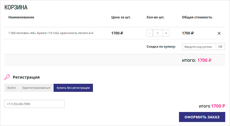 Вы можете заказать товар в нашем интернет-магазине полиграфической продукции двумя способами: через корзину или с помощью быстрого заказа.